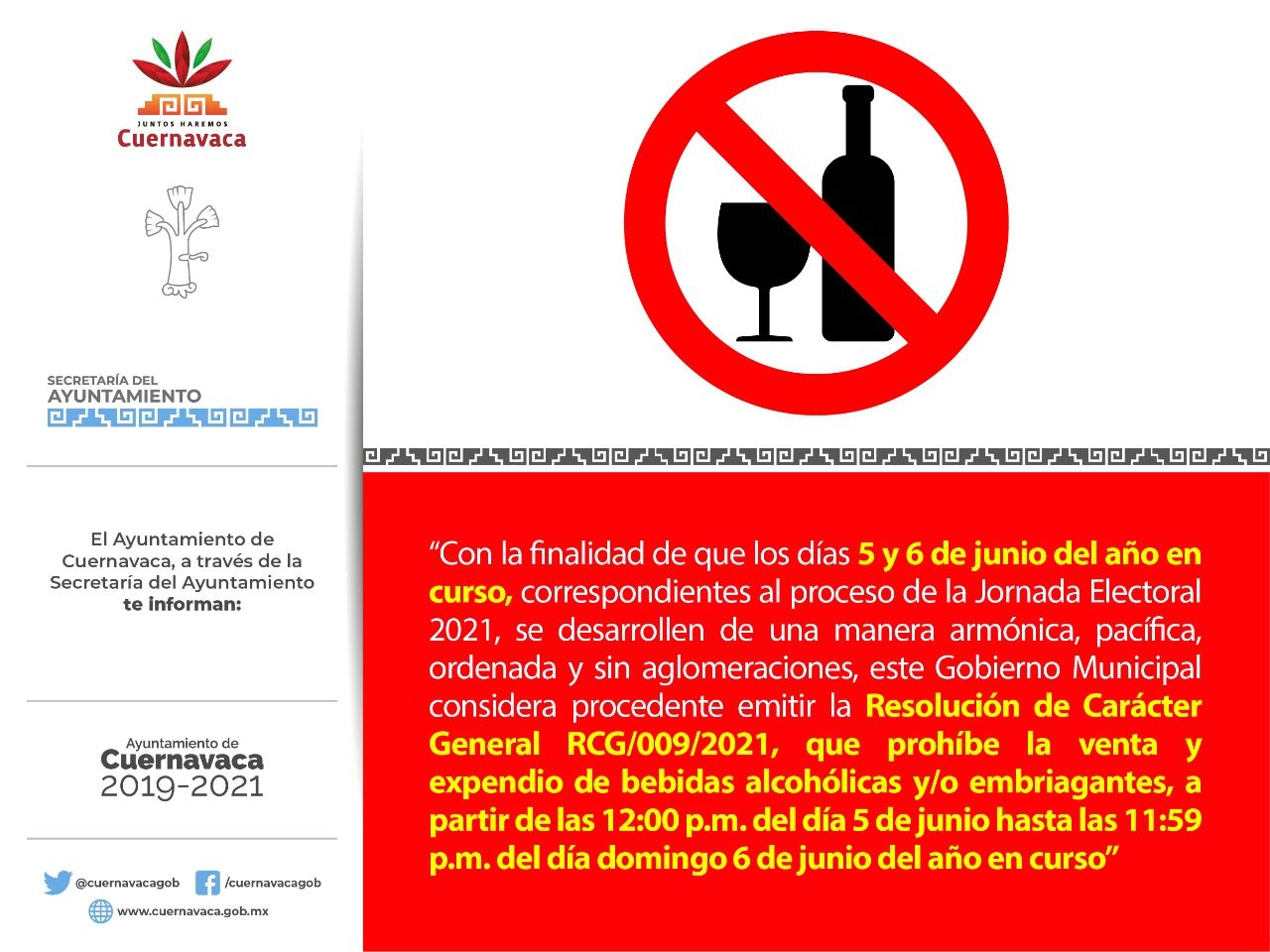 El Ayuntamiento de Cuernavaca decretó aplicar la llamada ley seca en la capital de Morelos para los próximos sábado 5 y domingo 6 de junio con la finalidad de que la jornada electoral se desarrolle de manera pacífica.
