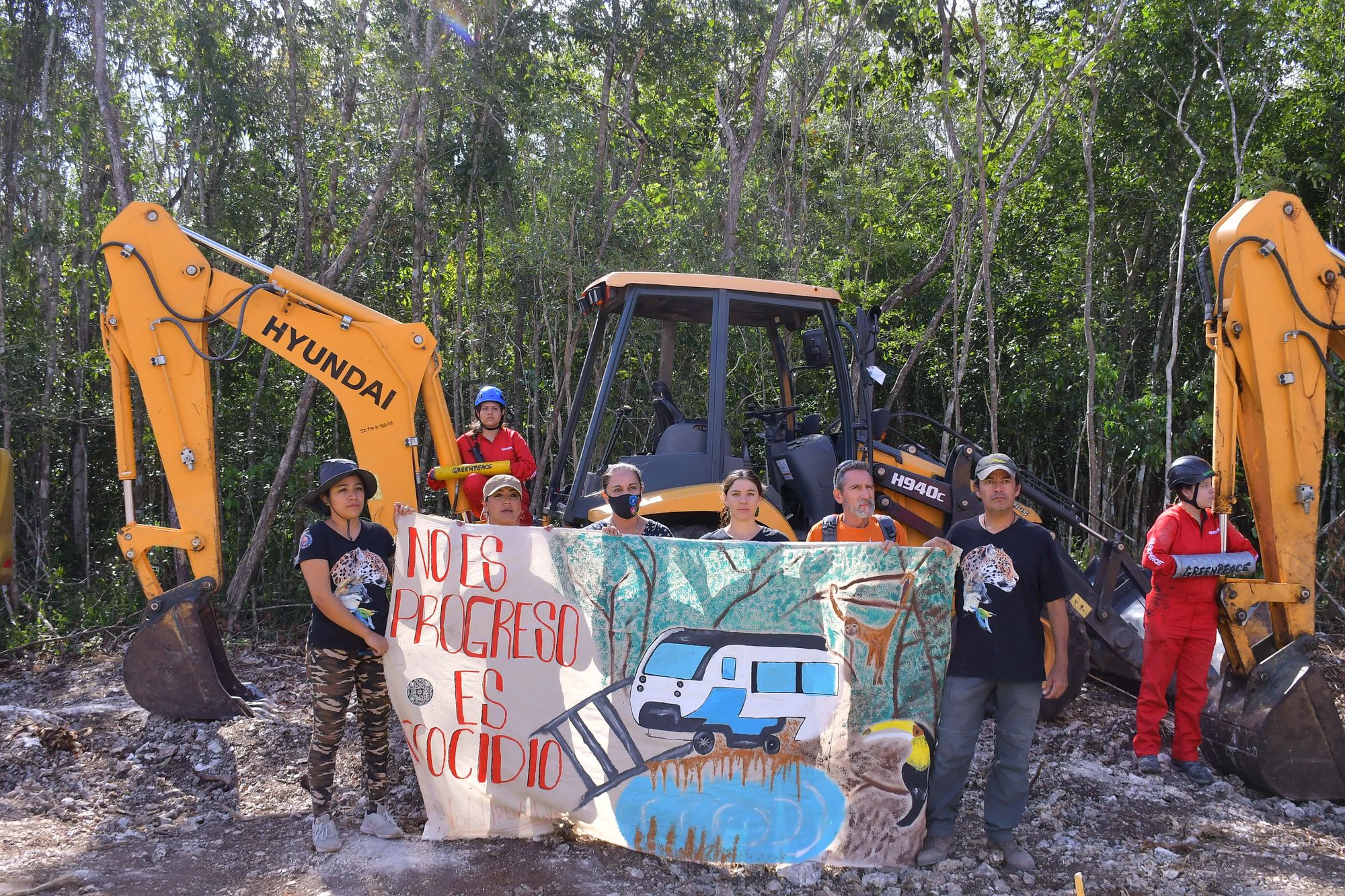 Activistas de Greenpeace y otros grupos ambientalistas frenaron simbólicamente los trabajos del tramo 5 del Tren Maya, que corre de Cancún a Tulum, en un intento por salvar de la destrucción los recursos naturales de la región.