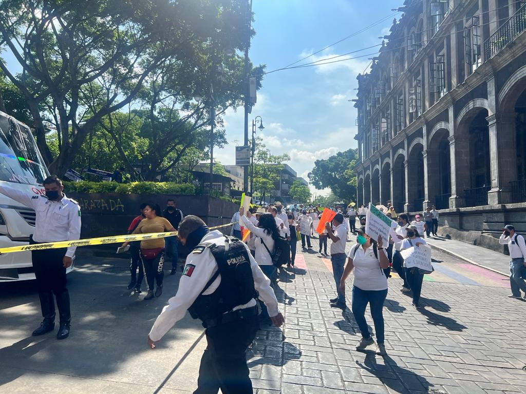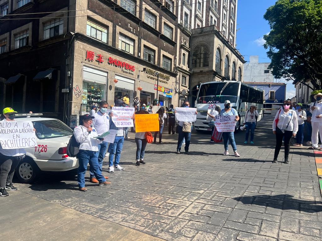 Maestros sindicalizados del Colegio de Bachilleres del Estado de Morelos (COBAEM), se manifestaron en la sede de este subsistema educativo en la colonia Leandro Valle de la colonia La Selva en Cuernavaca y posteriormente en el Centro de la capital para exigir basificaciones justas.