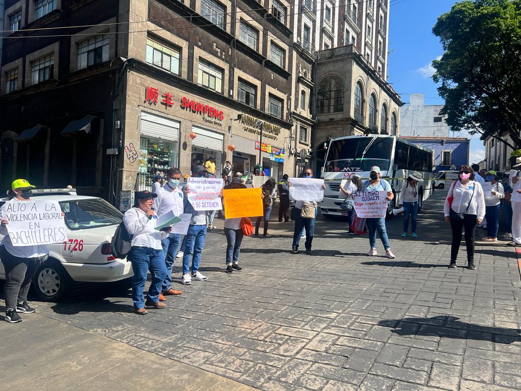Maestros sindicalizados del Colegio de Bachilleres del Estado de Morelos (COBAEM), se manifestaron en la sede de este subsistema educativo en la colonia Leandro Valle de la colonia La Selva en Cuernavaca y posteriormente en el Centro de la capital para exigir basificaciones justas.