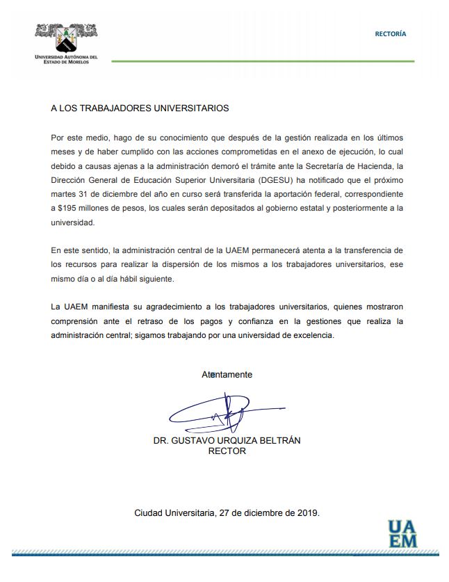 Autoridades de la Universidad Autónoma del Estado de Morelos dieron a conocer a través de un comunicado que en breve la federación hará una transferencia de $195 millones de pesos al Gobierno de Morelos y posteriormente serán transferidos a la Máxima Casa de Estudios para el pago de aguinaldo a trabajadores.