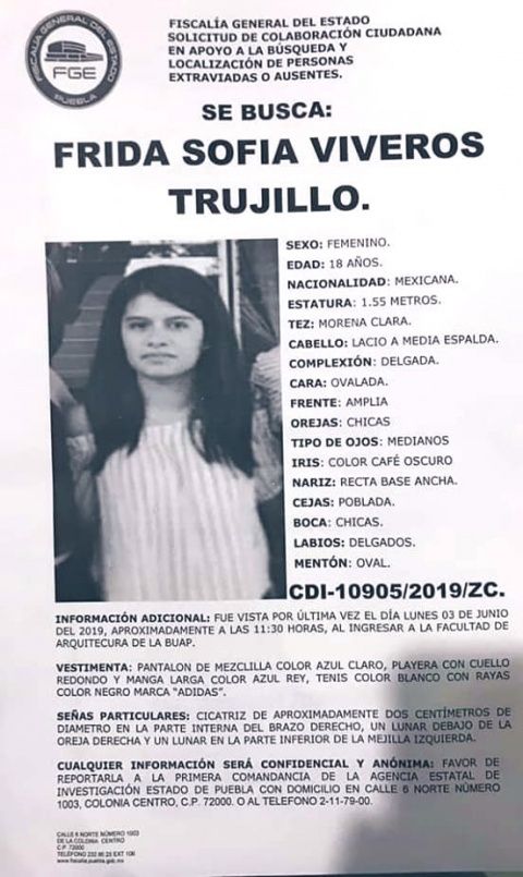 La Fiscalía en Puebla informó sobre la desaparición de Frida Sofía Viveros, una joven universitaria quien fue vista por última vez el pasado 3 de junio en la Facultad de Arquitectura de la BUAP.