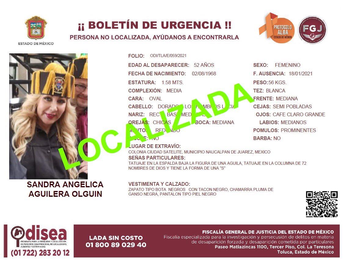 Hoy miércoles 20 de enero, se ha informado que Sandy Aguilera fue encontrada en un hospital del Estado de México, con vida, pero delicada de salud y con diversas heridas que ponen en peligro su vida. Incluso en redes se ha comenzado a pedir donadores de sangre para ella.
