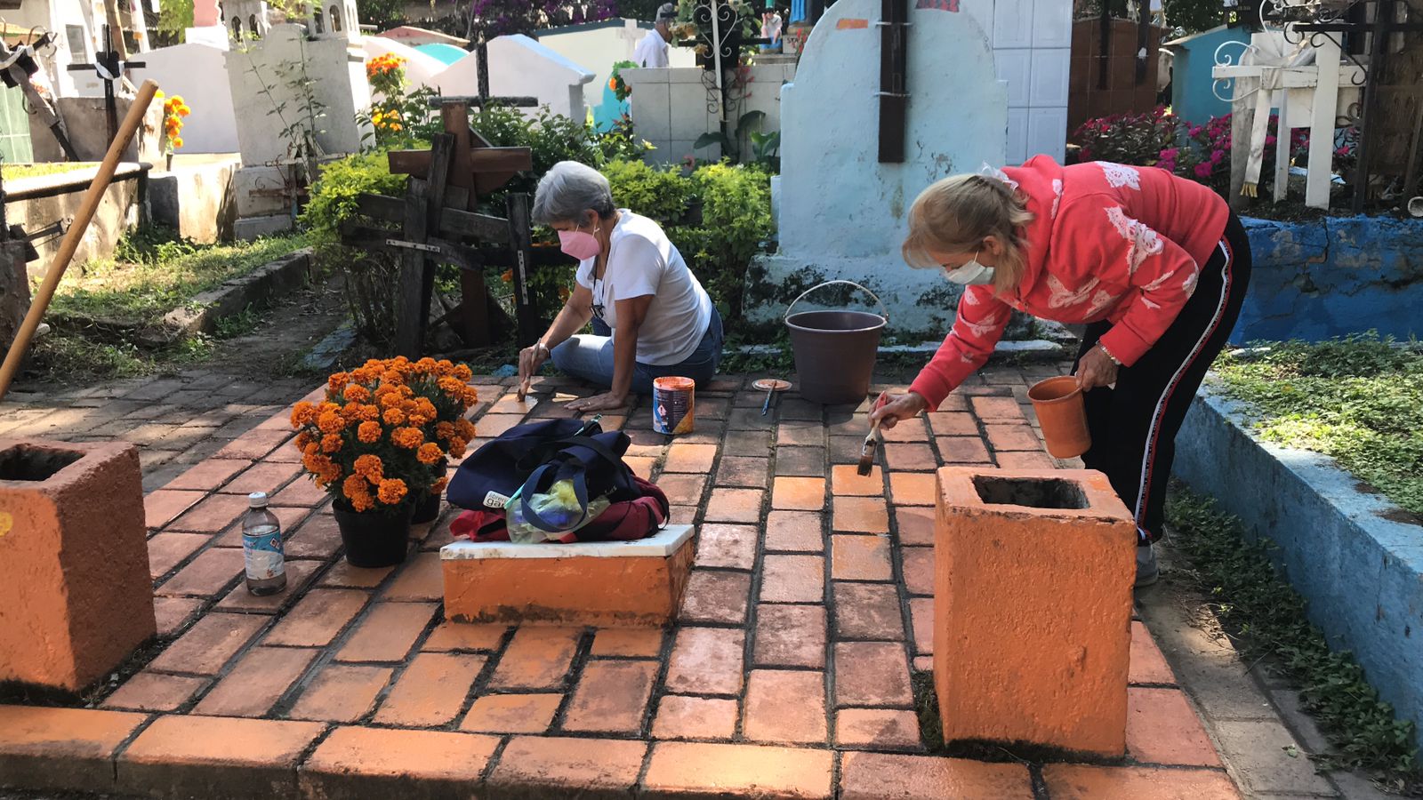 Elia y María Eugenia Ortega son dos hermanas que desde hace 50 años visitan la tumba en la que se encuentra su mamá y dos hermanos; cada año llegan al panteón ubicado en el municipio de Jiutepec.