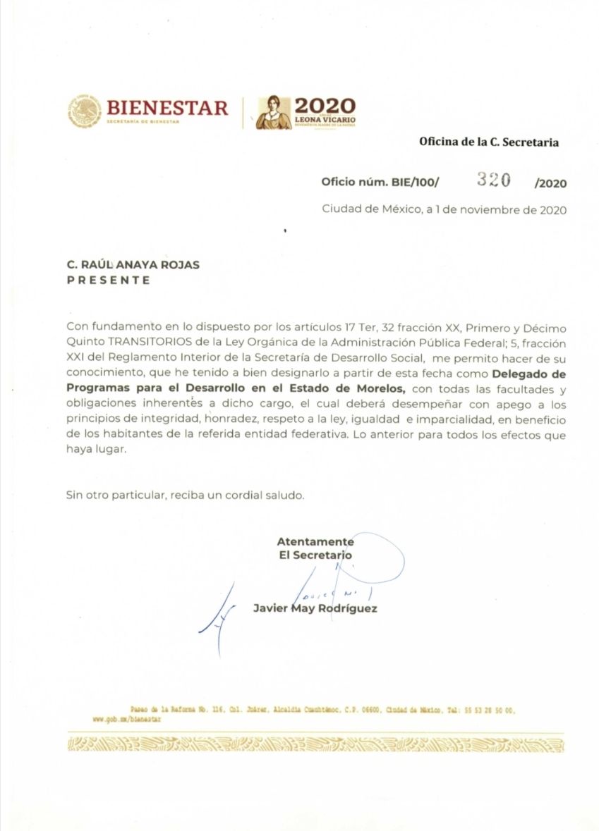 Luego de la renuncia de Hugo Eric Flores, el secretario de Desarrollo Social asignó a Raúl Anaya Rojas como Delegado Federal en Morelos.