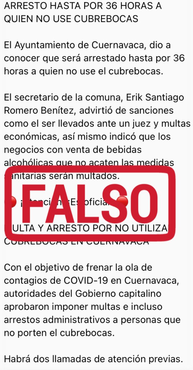 Este domingo autoridades del Ayuntamiento de Cuernavaca desmintieron la información que circula a través de redes sociales sobre el uso de cubrebocas.