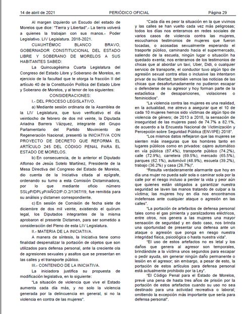 El Congreso de Morelos es pionero en el país en despenalizar la portación y uso de objetos de defensa personal, tal como el gas pimienta, que lamentablemente se ha popularizado en últimos años para que las mujeres puedan evitar algún robo o agresión en las calles.