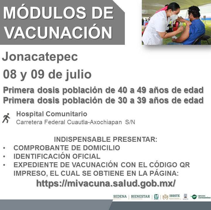 En Jonacatepec la aplicación de la vacuna contra COVID-19 se efectuará a partir de las 9:00 a.m. y hasta concluir las dosis asignadas en: Hospital Comunitario, carretera federal Cuautla-Axochiapan S/N.