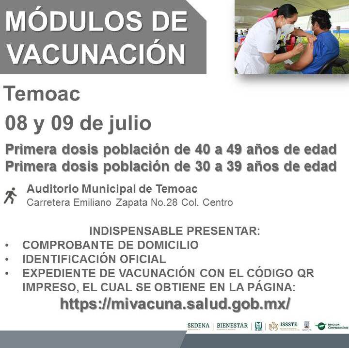 Para Temoac, la inmunización se realizará en el mismo horario de 9:00 a.m. y hasta finalizar también con las dosis asignadas en: Auditorio Municipal de Temoac, Carretera Emiliano Zapata 28, colonia Centro.