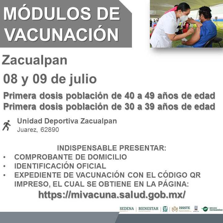 Mientras que en Zacualpan, la vacunación se llevará a cabo a partir de las 9:00 a.m. y hasta concluir las dosis asignadas en: Unidad Deportiva Zacualpan, Juárez, C.P. 62890, Zacualpan de Amilpas.