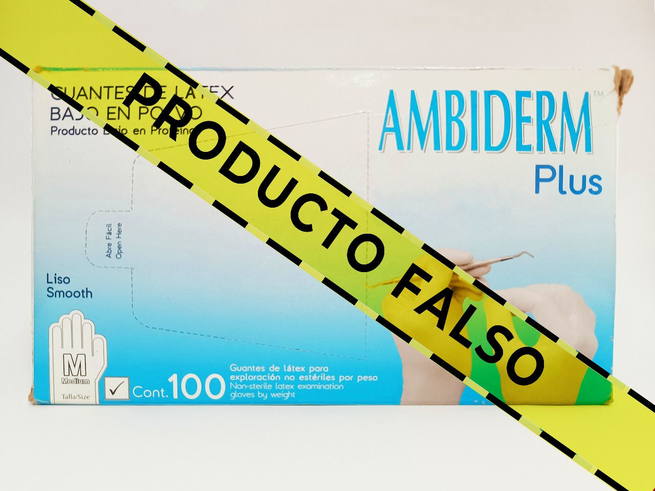 De acuerdo con la empresa Ambiderm Plus, no existe la presentación de caja color marrón con 100 piezas de guantes desechables, por lo que de detectarlos se pueden considerar falsos y de alto riesgo sanitario.