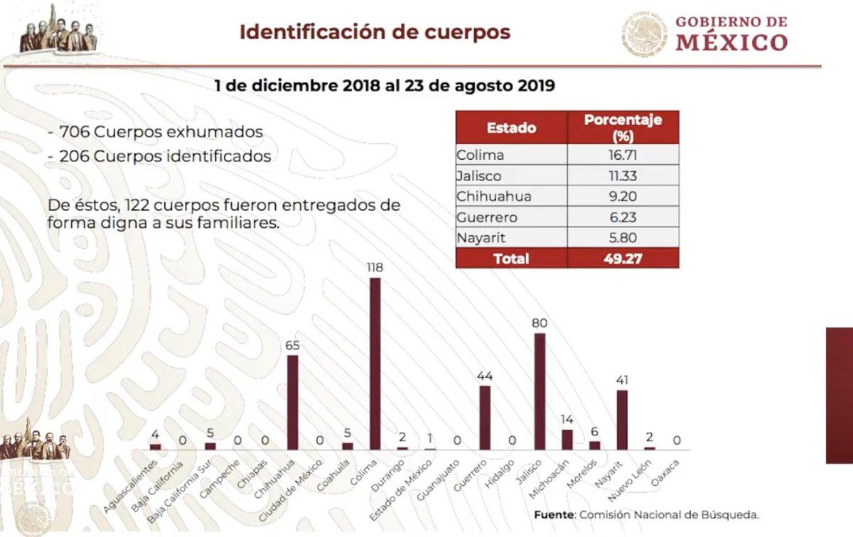 Señaló que son 706 cuerpos los que han sido exhumados, de los cuales 206 ya fueron entregados a sus familias. Dijo que se otorgarán 266 millones de pesos de subsidios a los estados para las omisiones locales de búsqueda.