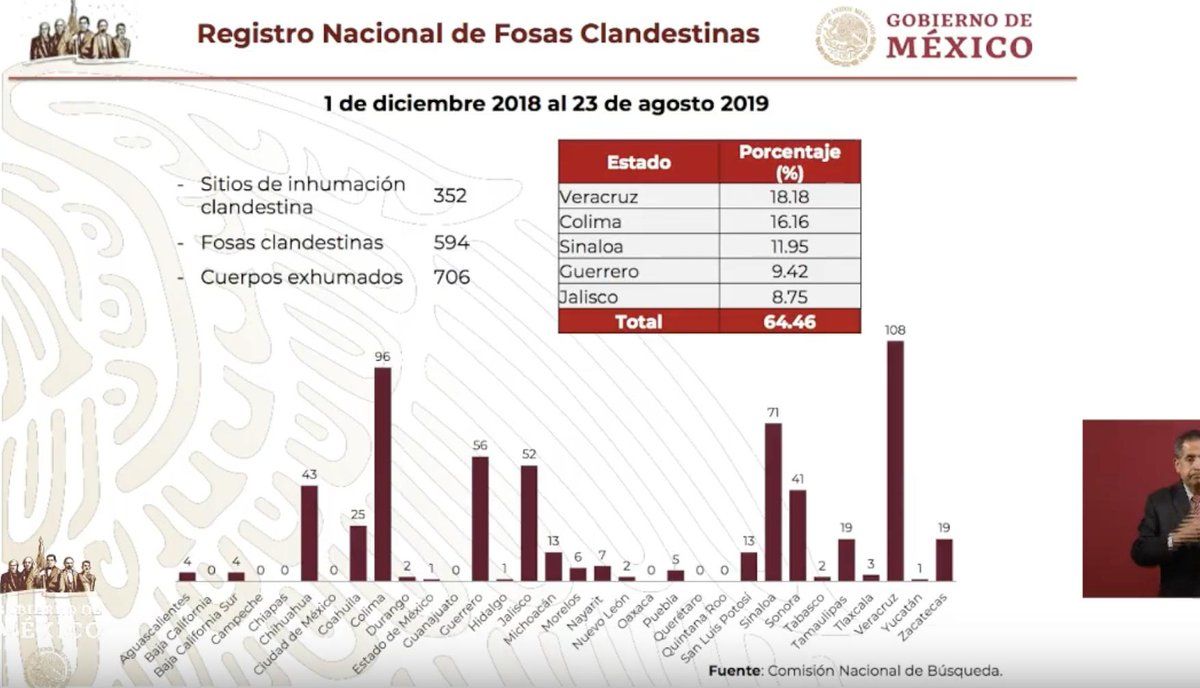 El subsecretario de Derechos Humanos, Población y Migración de la @SEGOB_mx, Alejandro Encinas, reveló que de diciembre de 2018 a agosto de 2019, se localizaron 352 sitios de inhumación donde se han encontrado 594 fosas clandestinas, de las cuales se han exhumado 706 cuerpos. pic.twitter.com/M8nocTDnwu