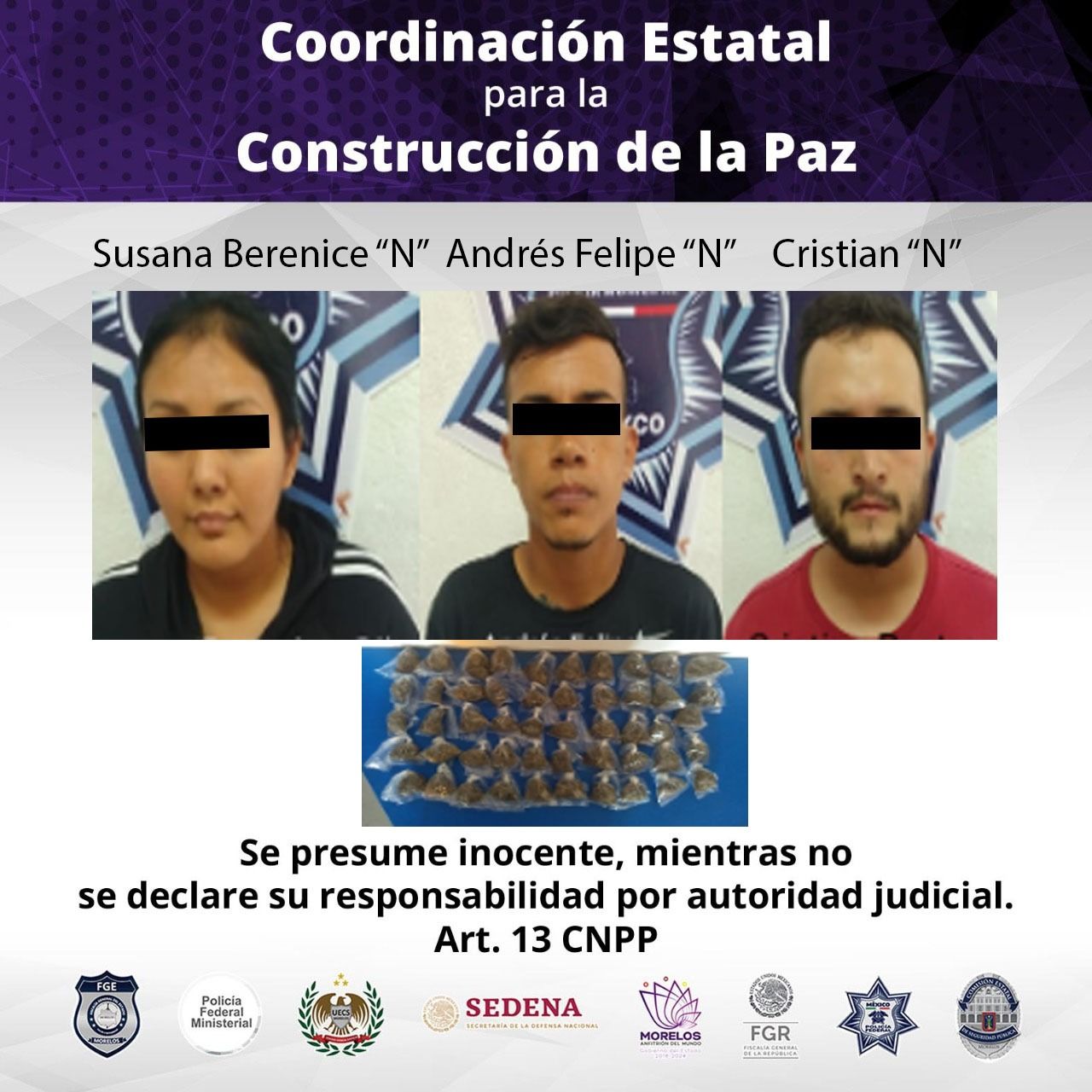 La tarde de ayer fueron detenidos una mujer y 2 hombres tras encontrarles 50 bolsitas que contenían vegetal verde con las características similares a la marihuana, en el municipio de Temixco.