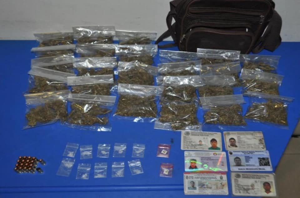 Mediante las medidas de seguridad lograron someterlos y al realizarles una revisión les aseguraron 25 bolsas plásticas que contienen vegetal verde con las características de la marihuana y 12 bolsas pequeñas que contienen una sustancia granulada con las características de la droga conocida como cristal; así como 17 cartuchos útiles y uno percutido calibre .32mm.