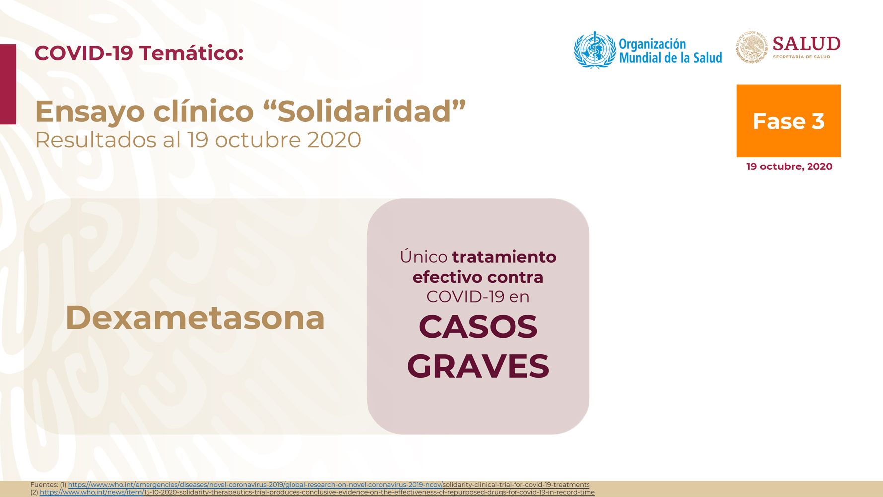 El secretario de salud del gobierno de México, Hugo López Gatell, informó que de acuerdo a los datos del ensayo clínico “Solidaridad” coordinado por la Organización Mundial de la Salud, el cual busca evaluar tratamientos contra el nuevo coronavirus Sars-Cov2, se concluyó lo siguiente.
