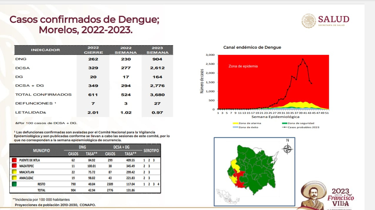 De los 3860 casos confirmados acumulados para Morelos, dos mil 612 sin de dengue con signos de alarma, 904 de dengue no grave y 164 de dengue grave.