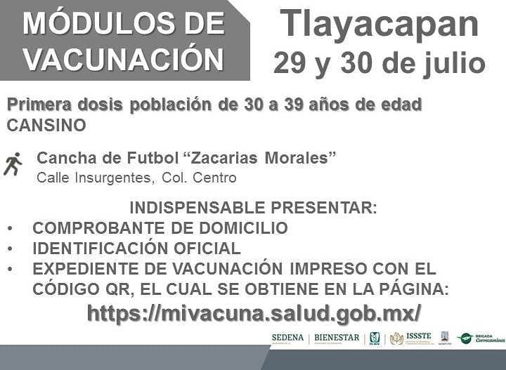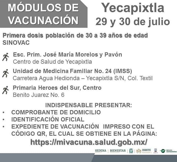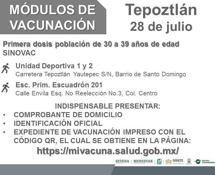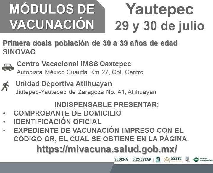 En estos municipios de Morelos se estará aplicando dosis de vacuna a personas de 30 a 39 años de edad durante los días 28 al 30 de julio, así como a rezagados de los demás sectores de la población.