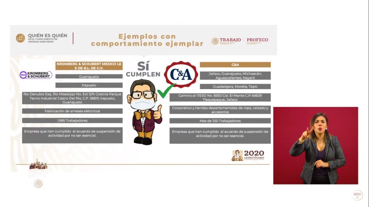 Tras los operativos de la Secretaría del Trabajo y Previsión Social (STPS) del Gobierno de México, su titular Luisa María Alcalde informó que el 95 % de las empresas no esenciales han cerrado como medida ante el COVID-19, pero el 5 % se niegan a suspender sus servicios.