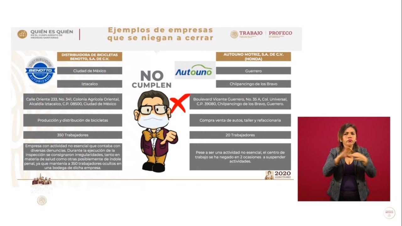 Desde “La Mañanera” de hoy, Alcalde informó que compañías automotrices, departamentales y de productos no esenciales son las que se han negado a cerrar, entre las cuáles se encuentran: