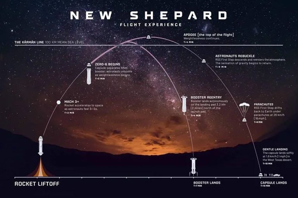 El viaje consistió en un vuelo suborbital de 10 minutos, con 3 minutos en el espacio exterior, para después volver a entrar a la atmósfera y caer lentamente al suelo utilizando unos paracaídas.
