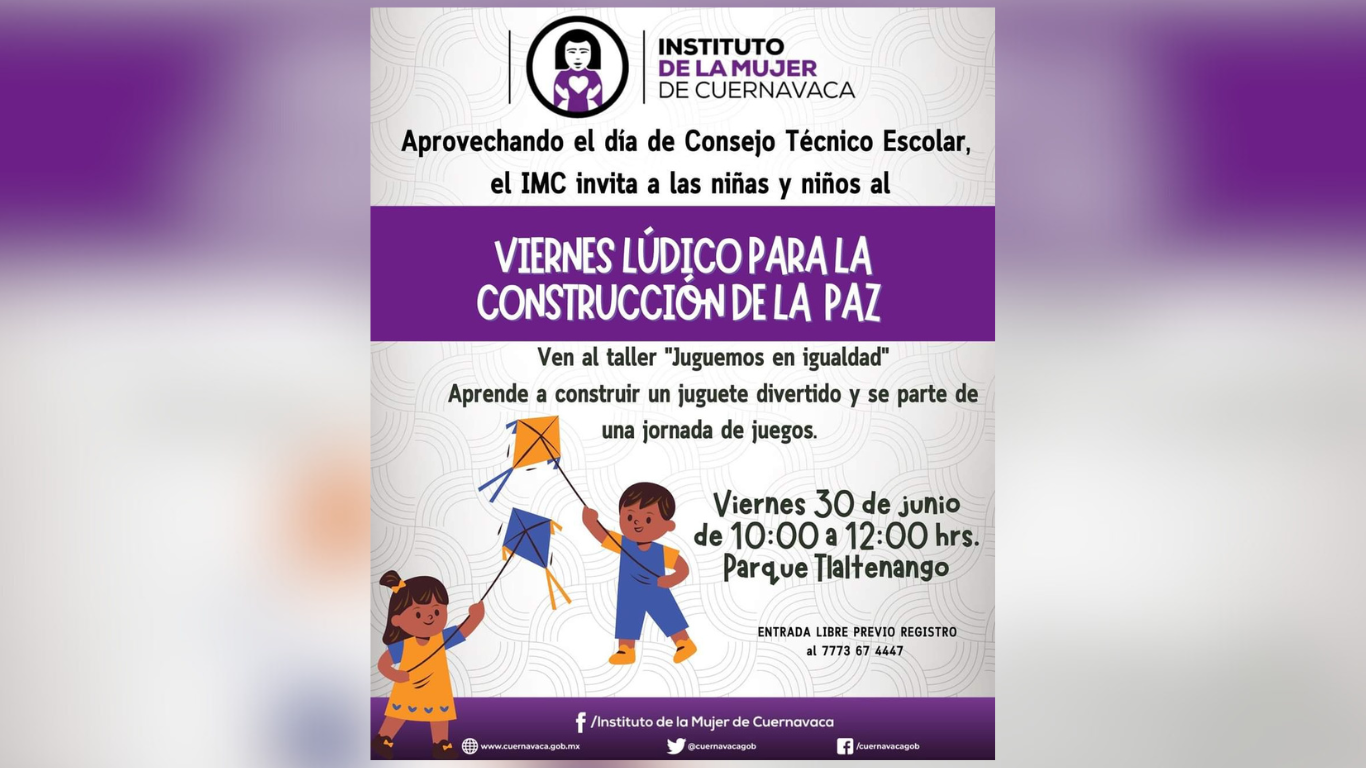 El Instituto de la Mujer de Cuernavaca hace la invitación a toda la comunidad al "Viernes Lúdico para la Construcción de la Paz". En esta ocasión, se estará ofreciendo un taller especial llamado "Juguemos en Igualdad", diseñado especialmente para los niños.