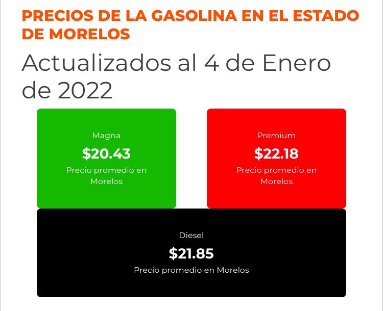 Comienza el 2022 y con ello algunos precios de productos o servicios comienzan a incrementar, tal es el caso de la gasolina, que, el precio promedio en Morelos es de 20.43 pesos para la magna, la premium de oscila entre los 22.18 por litro, mientras que el diésel tiene un precio de 21.85 pesos.