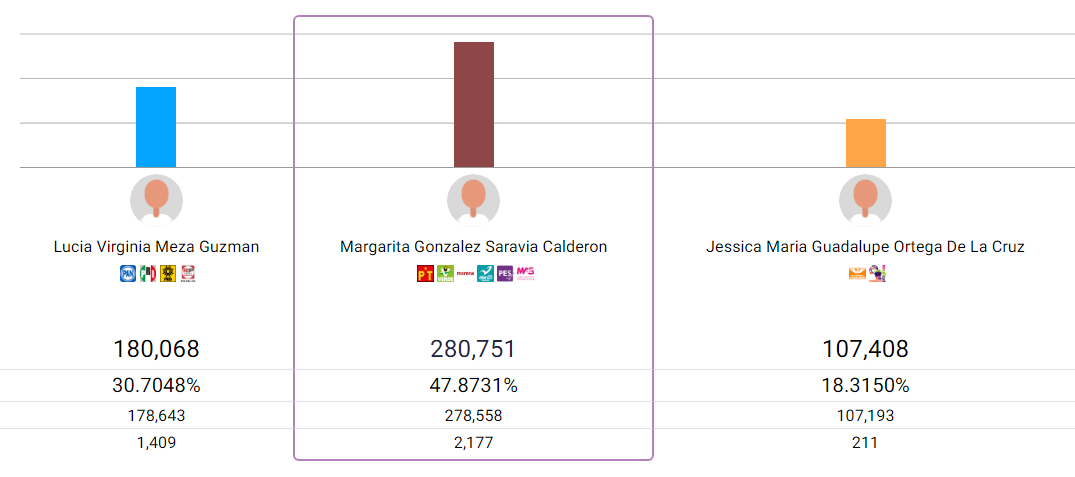 De acuerdo con el corte a las 20:00 horas del 03 de junio, Margarita González Saravia por la coalición “Sigamos Haciendo Historia”, cerró el conteo con el 47.8% de votos, lo que equivale a 280 mil 751; seguido de Lucía Meza Guzmán con el 30.7% de votos, equivalente a 180 mil 68 votos y Jessica Ortega De la Cruz con el 18.3% con 107 mil 408 votos.
