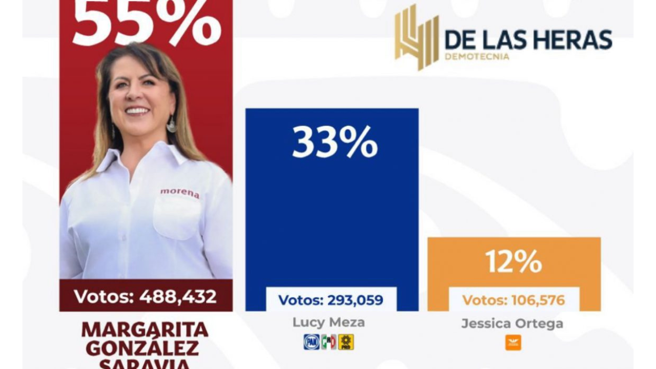 Mientras tanto, las encuestas de salida de la empresa de análisis Demotáctica, informó que Margarita presentaba una resultado del 52.5%, Lucy Meza con 35.4% y Jessica Ortega con el 12.1%.