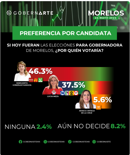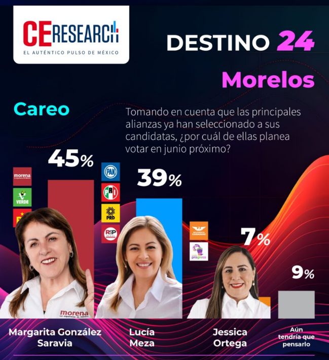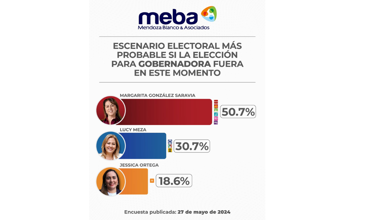 Mientras que la encuestadora CEresearch con cifras publicadas el 25 de mayo, reflejaron datos que posicionaron a Margarita González con el 45%, seguido de Lucy Meza con 39% y Jessica Ortega con 7%.