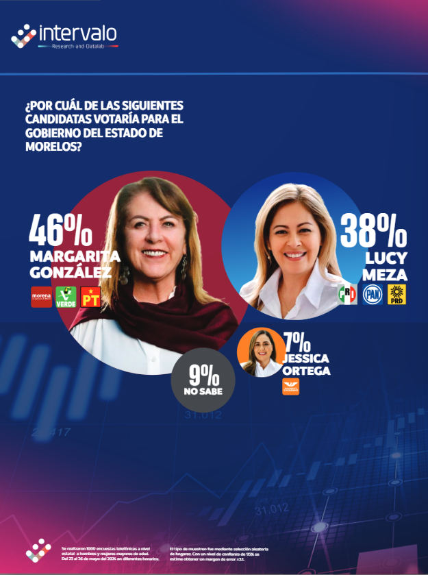 Intervalo Research, también fue de las más cercanas, puesto que al publicar sus resultados el 27 de mayo, posicionó a Margarita González Saravia con un 46% de preferencia, seguido de Lucy Meza con 38%, y Jessica Ortega con 7%.