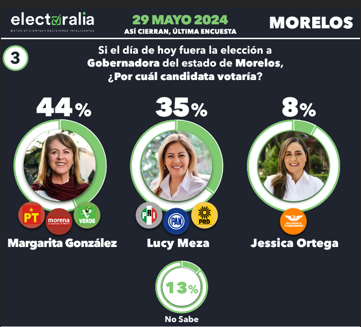 Otra de las encuestadoras que también presentó un resultado cercano fue Electoralía la cual publicó sus resultados el 28 de mayo, en ellos posicionó a Margarita González Saravia con el 44%, seguido de Lucy Meza con 35% y Jessica Ortega con 8%.