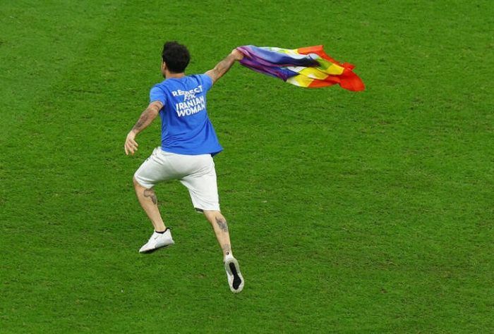 Durante el partido disputado el día de ayer entre la Selección Nacional de Portugal y la Uruguaya, un aficionado de nacionalidad italiana irrumpió en la cancha, vistiendo una playera en la que se leía “Salven a Ucrania” y “Respeto por las mujeres iraníes”, mientras sostenía en sus manos la bandera LGBTTIQ+.