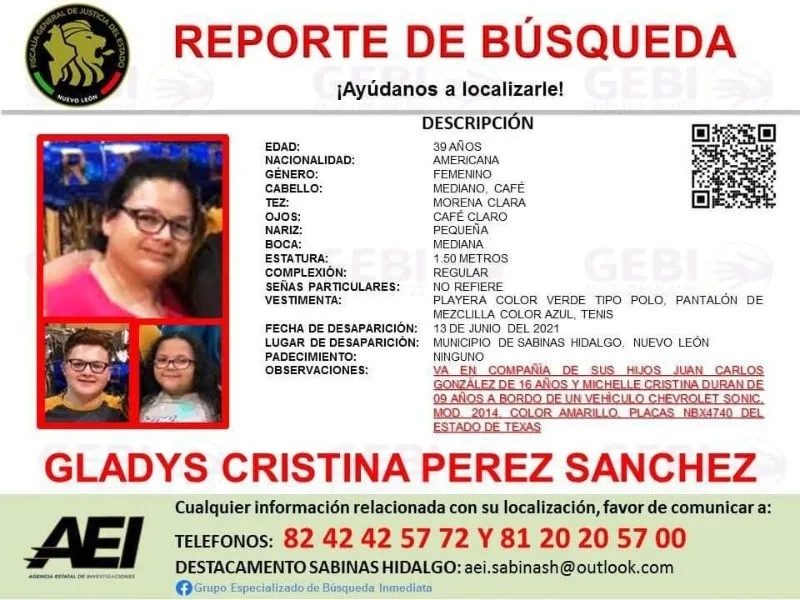 Luego de diez meses de que se reportara su desaparición, las autoridades de Nuevo León encontraron los cuerpos sin vida de Gladys Pérez Sánchez y sus hijos John Carlos y Michelle Cristina, quienes desaparecieron desde el 13 de junio de 2021 cuando circulaban por la autopista en dirección hacia Monterrey, luego de una visita familiar.