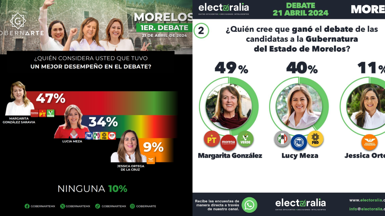 Después del debate convocado por el Impepac, donde participaron las tres candidatas a la gubernatura del estado de Morelos, cuatro casas encuestadoras arrojaron en sus resultados que la ganadora es la candidata Margarita González Saravia de la coalición Sigamos Haciendo Historia.