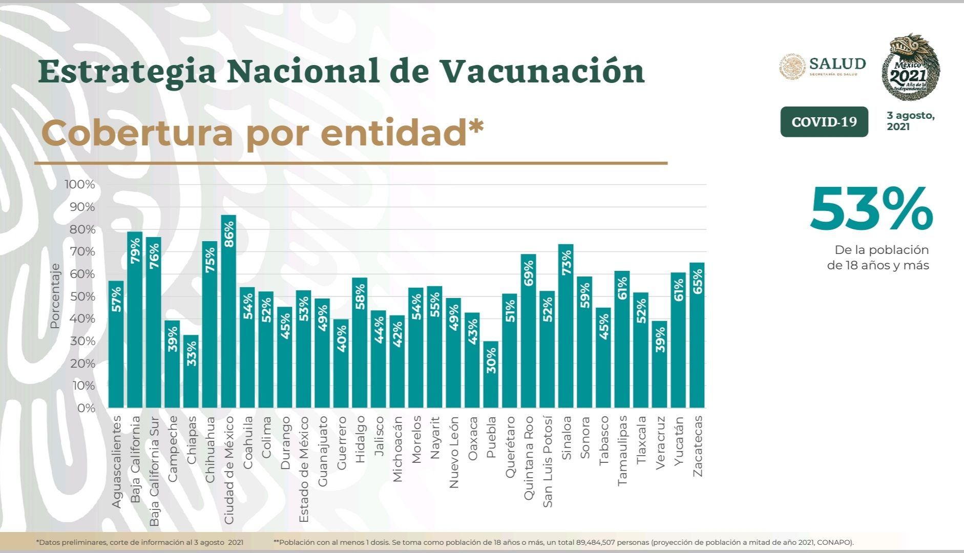 La Secretaría de Salud del Gobierno de México indica que en 20 estados de la República Mexicana se ha vacunado a más del 50 % de la población adulta con al menos una dosis.