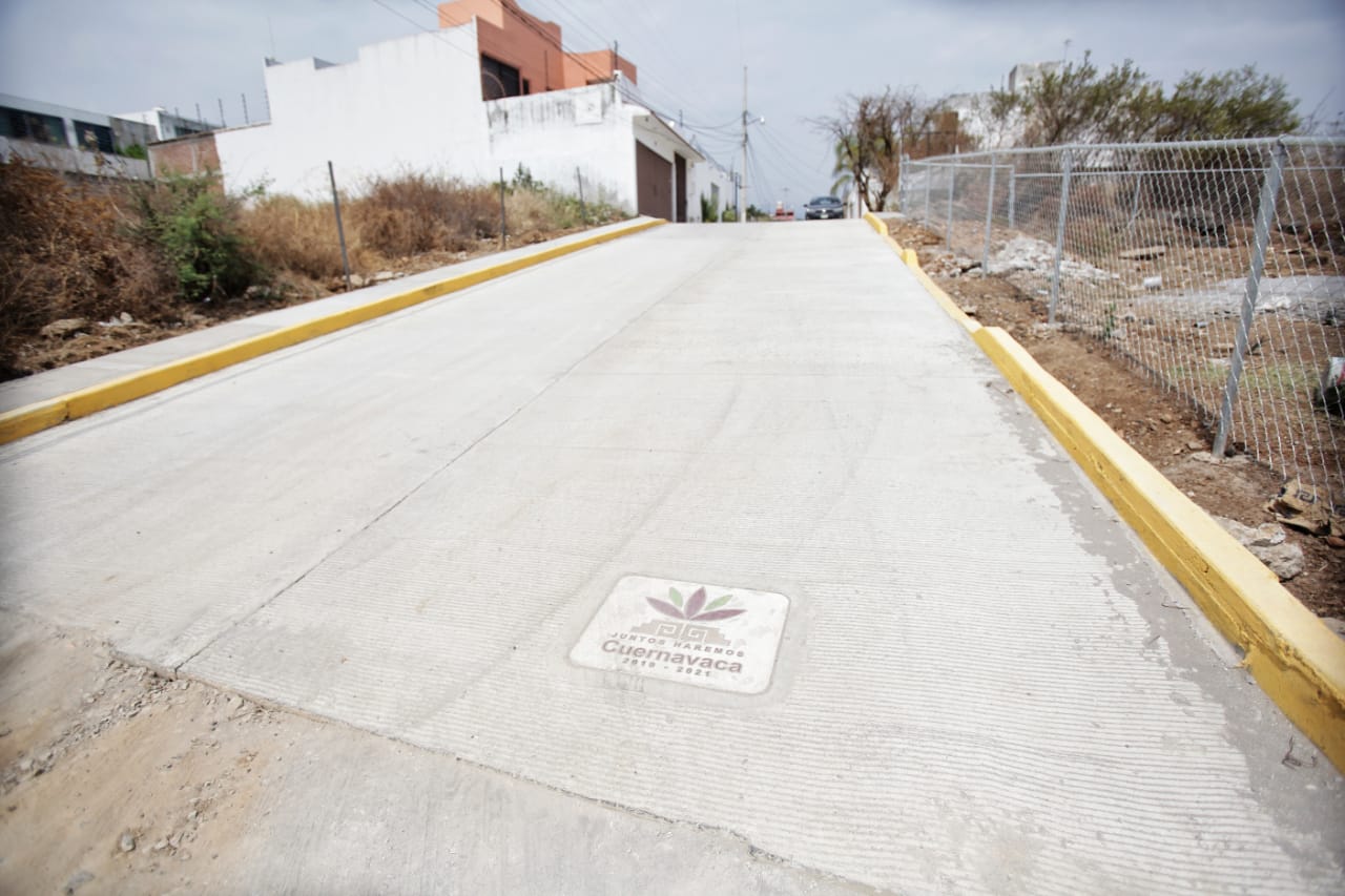 El pavimento de la nueva calle es de concreto hidráulico, con guarniciones, banquetas, balizamiento, lona informativa, placa, nomenclatura, pruebas y limpieza final.