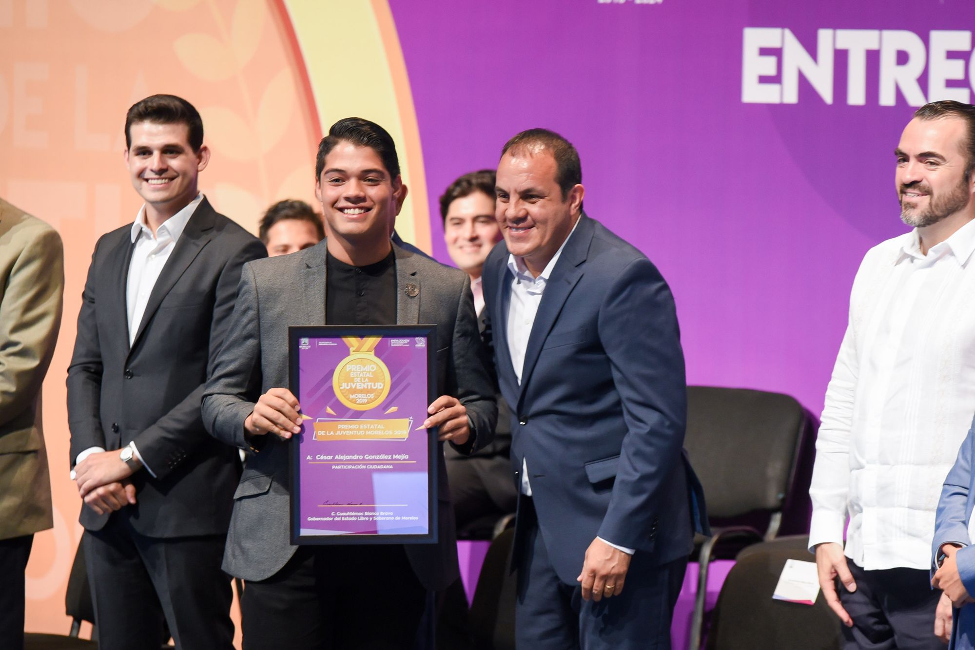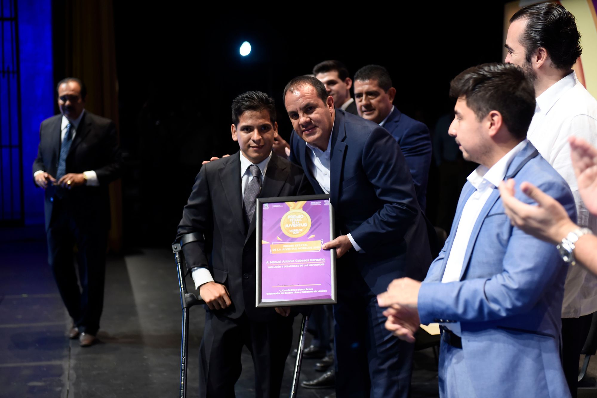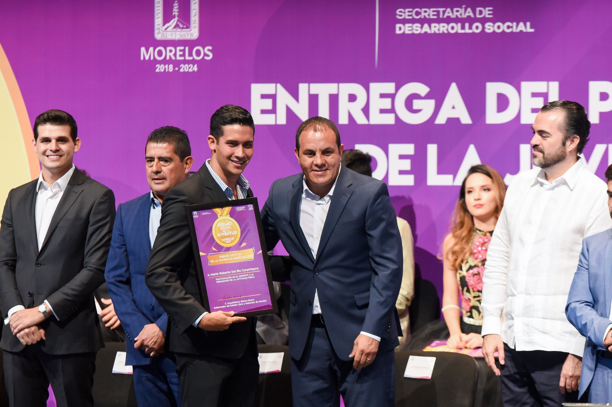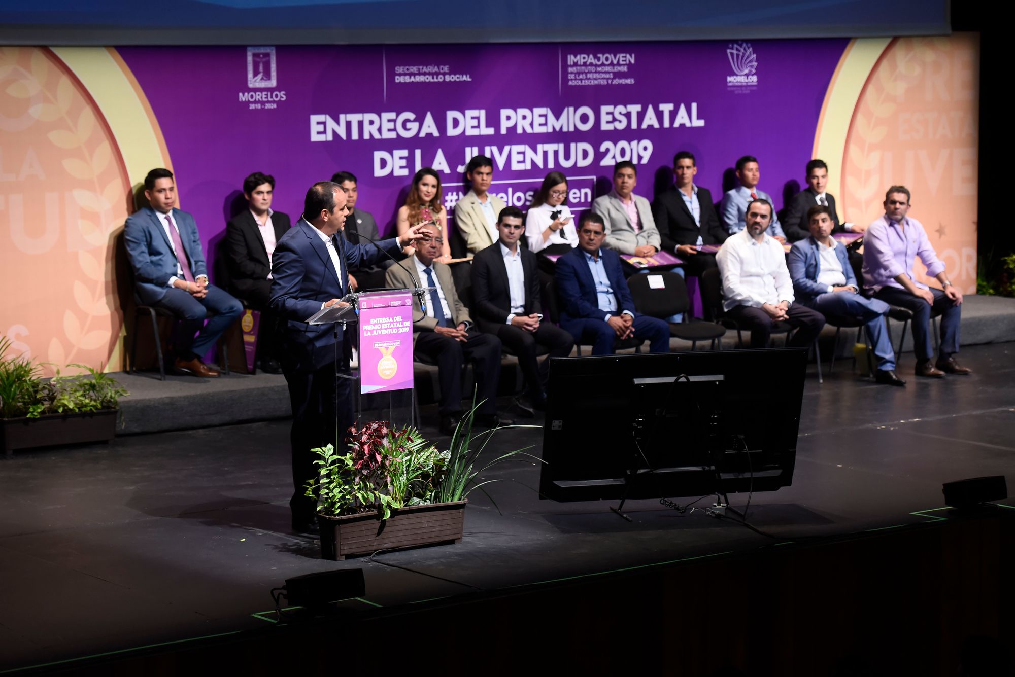 El gobernador Cuauhtémoc Blanco Bravo, presidió la entrega del Premio Estatal de la Juventud 2019 a jóvenes que de manera individual o colectiva, destacaron en temas para el desarrollo integral de las juventudes.