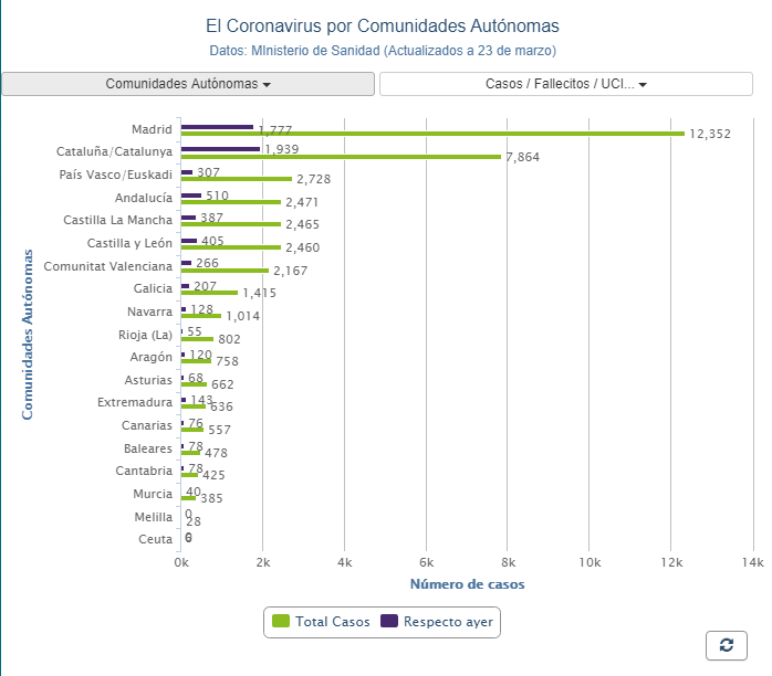 La ciudad española con más fallecimientos es Madrid con 1,535 y más de 12 contagiados.