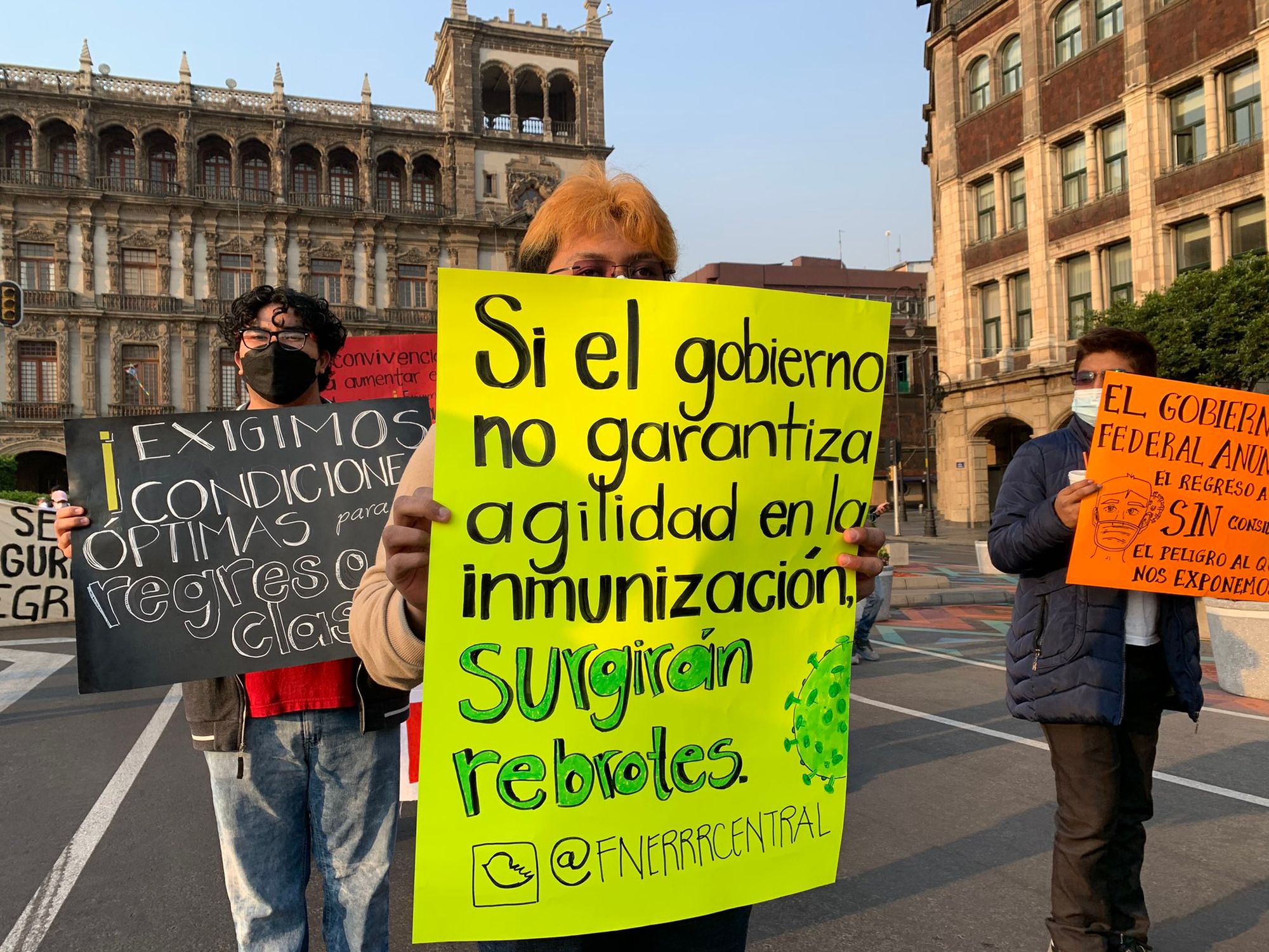 “Exigirle a Andrés Manuel López Obrador que atienda la demanda estudiantil. Coincidimos que es necesario regresar a las clases presenciales, por supuesto, porque ya vimos que el Aprende en Casa 1, y Aprende en Casa 2 no tienen un puerto seguro, lo contrario, hay rezago y deserción, pero exigimos un regreso a clases vacunados, que no se nos excluya de la vacunación, que sea a toda la comunidad educativa que va a estar en las escuelas”.Federación Nacional de Estudiantes Revolucionarios FNER