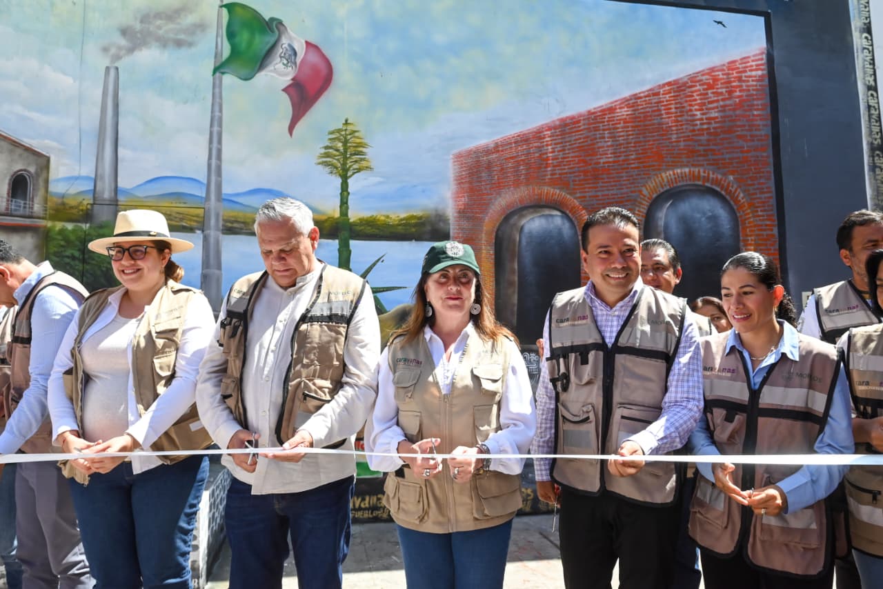 Como parte de su visita, la jefa del Ejecutivo estatal inauguró un mural conmemorativo creado por el artista Rodrigo Tapia, que retrata lugares emblemáticos de Miacatlán, municipio reconocido por su producción de mezcal y su riqueza cultural.