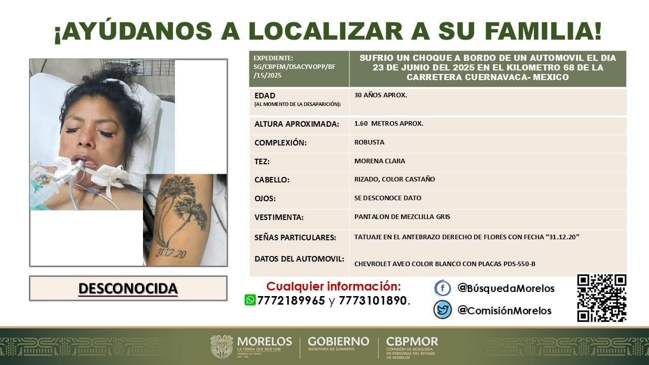 Hasta el momento, permanece sin ser identificada y sus familiares no han sido localizados, pese a la ficha de búsqueda emitida por el gobierno del estado de Morelos.