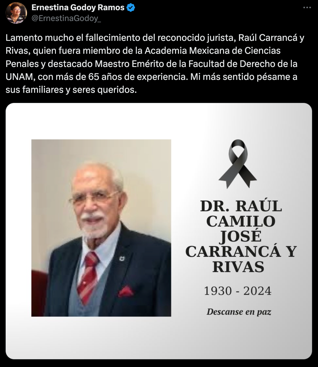 “Con profundo pesar, lamento el sensible fallecimiento del estimado jurista Raúl Carrancá y Rivas, profesor emérito de la @UNAM_MX. Su legado jurídico, su excepcional calidad humana y sus sólidos valores han dejado una huella imborrable.”