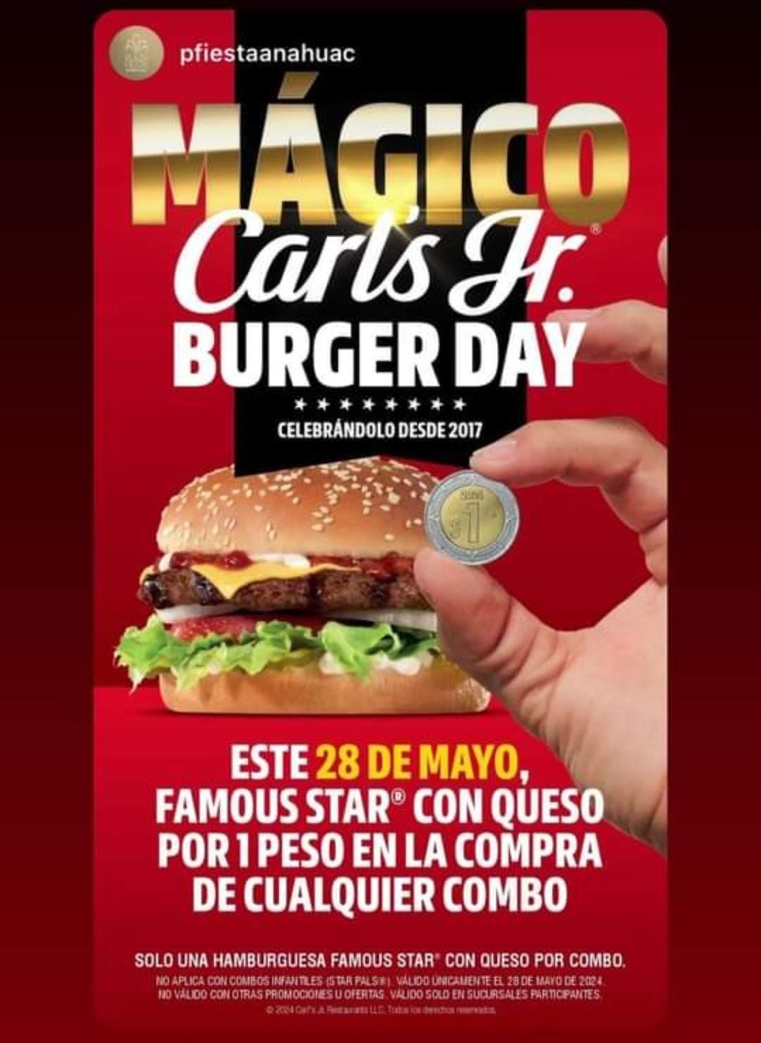 -Carl's Jr: sorprende a sus clientes con una promoción única: la famosa hamburguesa Famous Star con queso estará disponible por solo un peso al adquirir un combo. Esta oferta es una oportunidad perfecta para disfrutar de una de las hamburguesas más emblemáticas de la cadena a un precio simbólico.