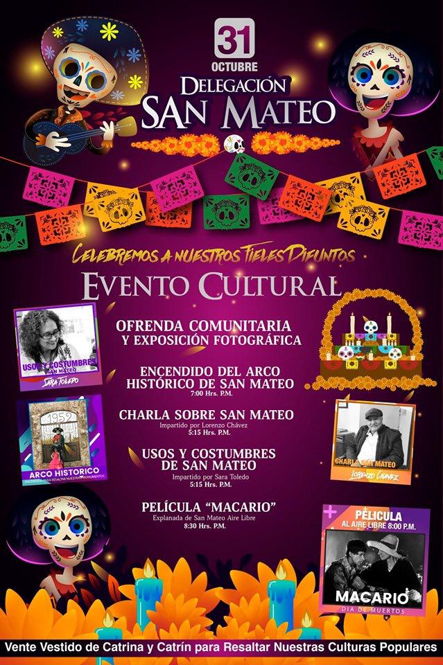 Habrá la exposición de un tapete monumental, exhibición de ofrenda y concurso de catrinas, así como la proyección de la película mexicana, “Macario”.