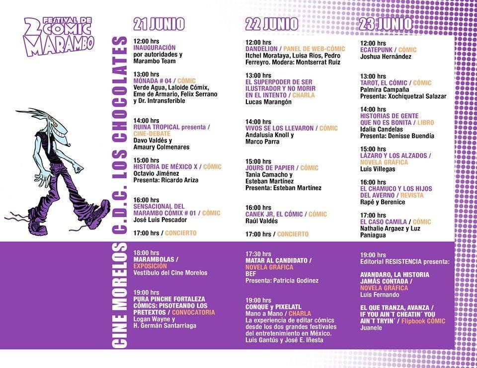 A partir de este viernes 21 de junio hasta el día 23, se llevará a cabo el Segundo Festival del Cómic Marambo, con actividades en el Cine Morelos y el Centro de Desarrollo Comunitario Los Chocolates, ubicado la colonia Carolina del municipio de Cuernavaca.