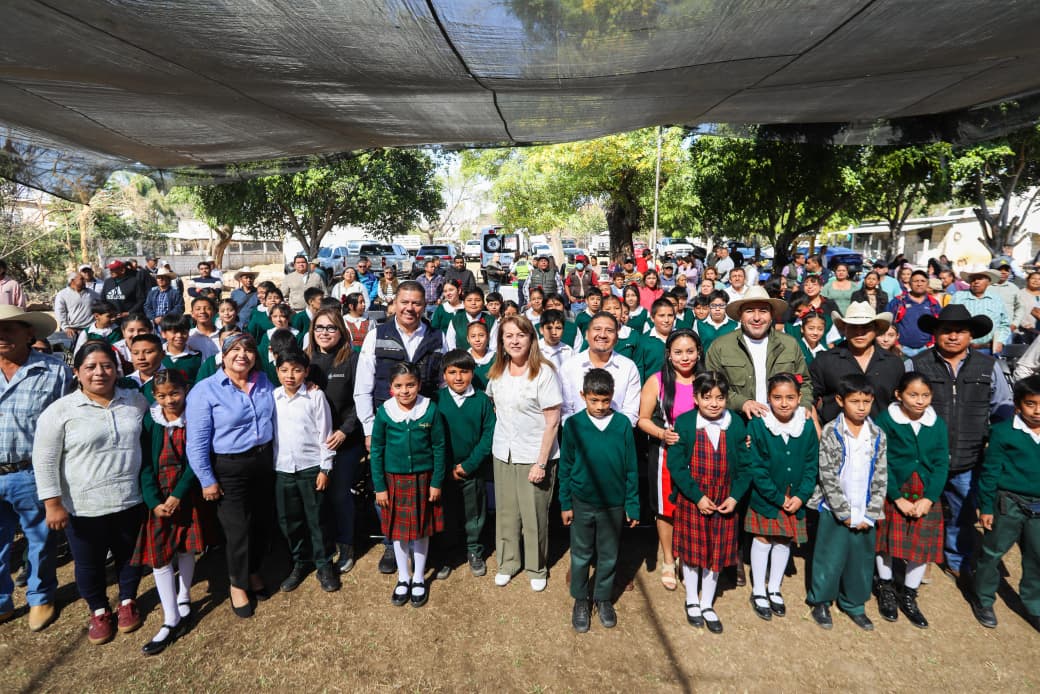 Posteriormente, en Jantetelco inauguró una techumbre construida con recursos del Fondo de Aportaciones Múltiples, que ofrecerá un espacio digno y seguro para el desarrollo académico y cultural de la comunidad escolar.