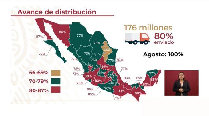 Moctezuma indicó que son en total 178 millones de libros de texto gratuitos los que se encuentran distribuyendo en todo el país, reportando un avance de entre el 80 % y 87 %.
