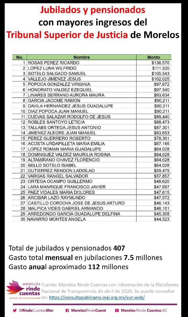 El centro de investigación Morelos Rinde Cuentas, reveló un listado de 30 ex funcionarios y las cantidades que cobran al mes por dichos conceptos.