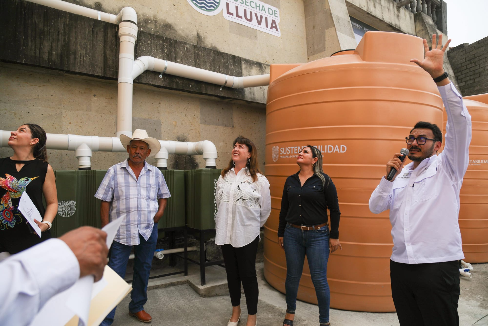 El secretario de Desarrollo Sustentable, Alan Dupré, explicó que el sistema incluye dos cisternas con capacidad para almacenar hasta 892 mil litros de agua durante la temporada de lluvias, ayudando a prevenir inundaciones y aprovechando el recurso pluvial.